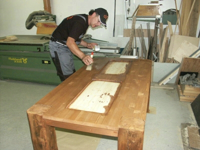 • Damit das zu den restlichen Möbeln passt..., ... beizen und lasieren wir ihn, nun kann der Alte auch kleckern!